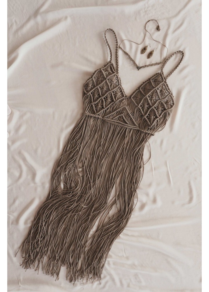 is a sculptural expression of handcrafted macramé designed to move beautifully with the body. Intricate knotwork shapes the bust while long cascading fringe creates fluid movement with every step.