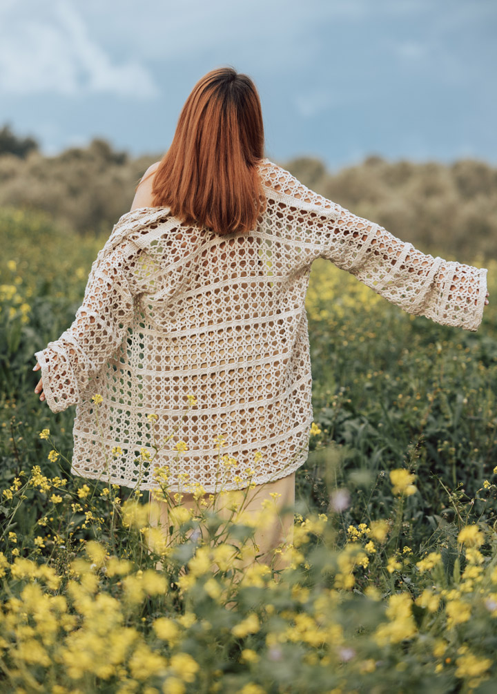 Handwoven with the golden patience of hands that honor tradition, this crochet cardigan is a soft ode to sunlit wanderings and slow, sacred beauty. Each loop and lattice is crafted by skilled artisans using fine crochet techniques—an artistry that dances between delicacy and strength.