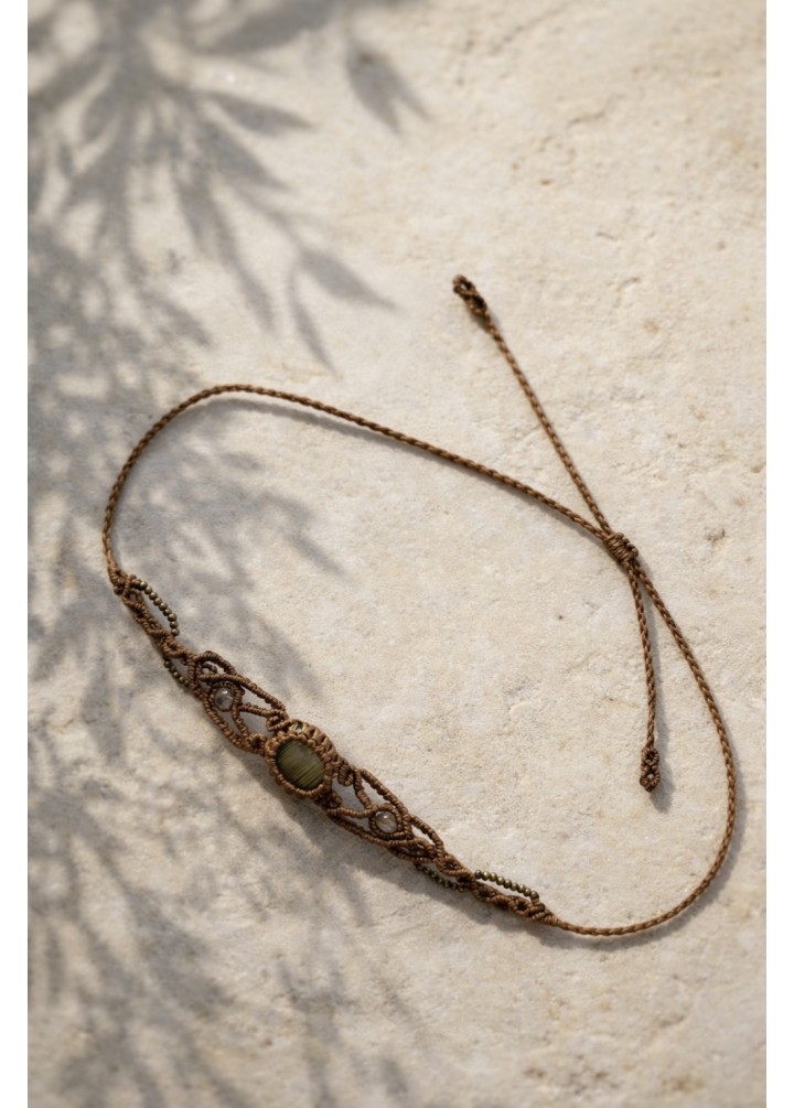 The piece extends horizontally with delicate patterns and features an adjustable cord for versatile styling. It can be worn as a statement necklace along the neckline or styled across the forehead as a bohemian headpiece.