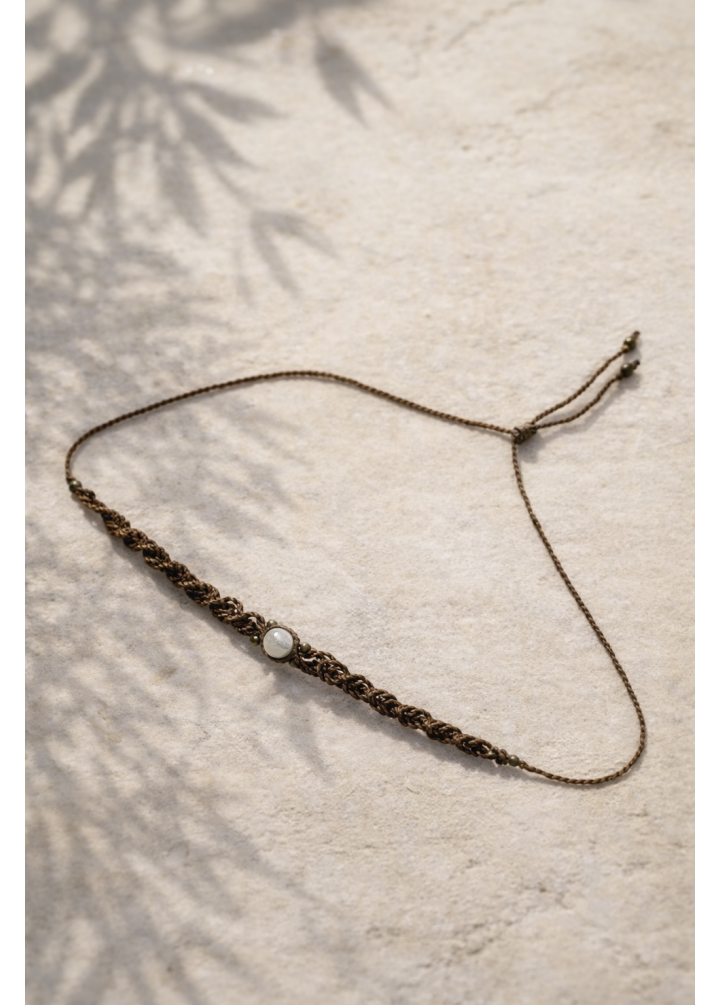 At the center, a natural moonstone is set within a slender line of intricate macrame knotwork, offering a soft, luminous focal point. The elongated linear composition creates an understated expression of artisanal jewelry.
