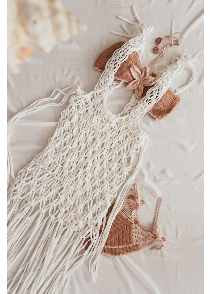 Created using traditional macramé techniques, the design forms an open textured structure that allows light and air to move through the piece. The elongated silhouette drapes naturally over the body, creating a soft layered effect that complements swimwear and summer styling.